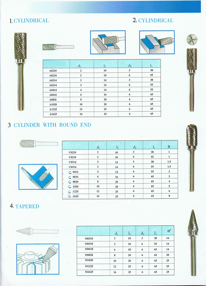 1. Various shapes of Carbide Burrs are available 2. Well for single cut, double cut, Alu Cut 3. According to DIN standard. Cylindrical, Cylindrical End Cut, Cylindrical Radius End, Ball End, Three Point End, Oval End, Taper or Cone Flat End, Taper or Cone Radius End, Three Radius End, Flame End. |